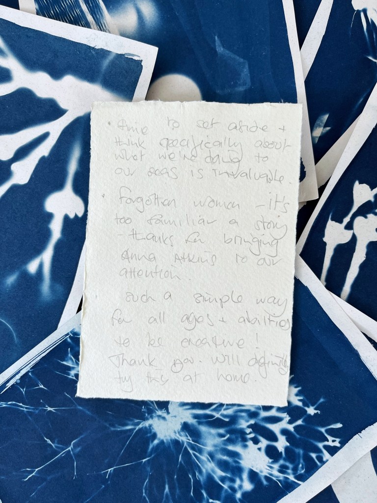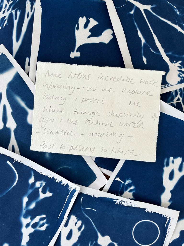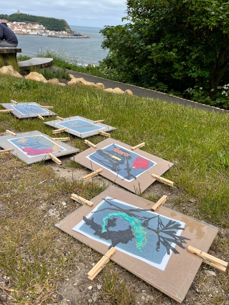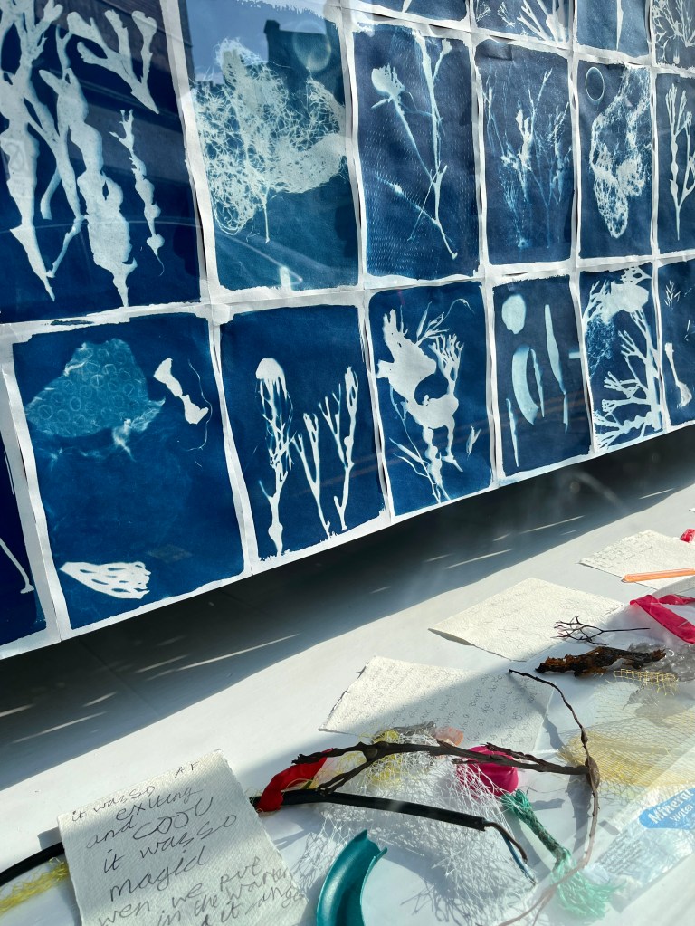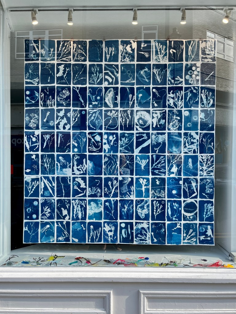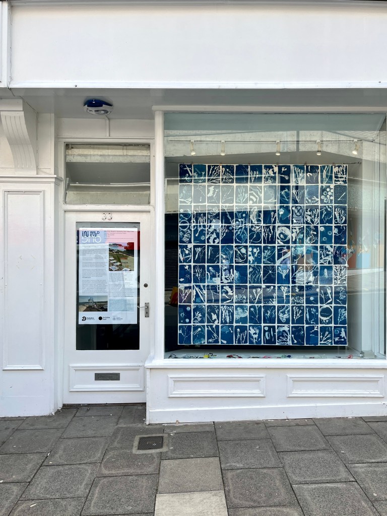 In the summer of 2023 I launched the exhibition of the community art project I had been working on in the beginning half of the year. Commissioned by Invisible Dust and Yorkshire Wildlife Trust as part of their Wild Eye art and nature project, I worked with different community groups and members of the public introducing them to the pioneering work of English botanist and artist Anna Atkins and the photographic process cyanotype, to make images using seaweed and litter collected from local beaches. Groups included Scarborough Sixth Form, Barrowcliff Primary School, Scarborough Disability Action Group, and Gallows Close Community Centre. The project, “After Anna: Blueprint Impressions from Today’s Seas” reflects on the important role of seaweed to help mitigate climate change as well as the problem of marine pollution. It references Atkins’s extensive study “Photographs of British Algae: Cyanotype Impressions (1843-1853), considered the first book to have been illustrated with photographic images, and reflects on how our seas have changed in the 180 years since it was first published, with several species of seaweed now lost and an ever increasing amount of plastic waste invading the marine ecosystem. The project resulted in an exhibition across two spaces in Scarborough: a shop window at 33 Newborough, where the original prints were exhibited, and large scale banners of a selection of the prints were displayed in the iconic Scarborough Market Hall.