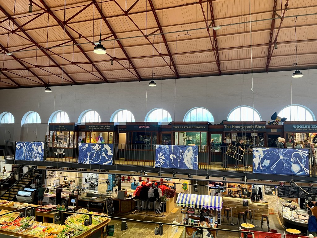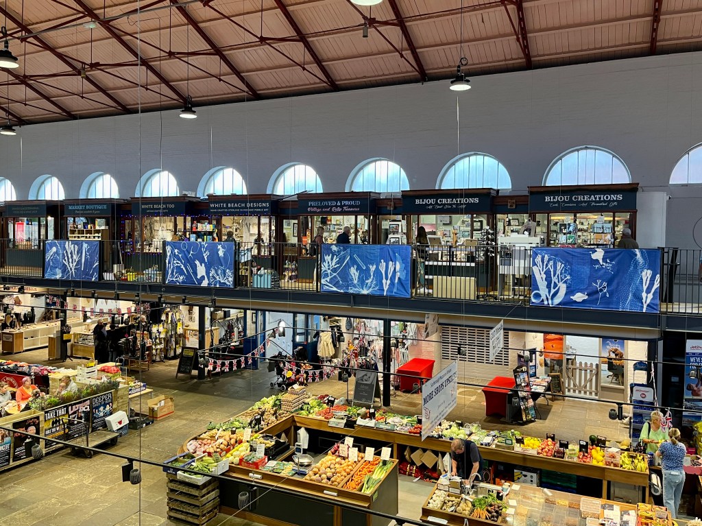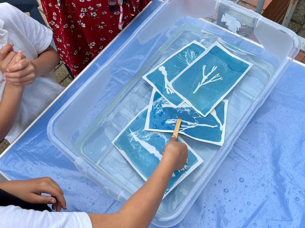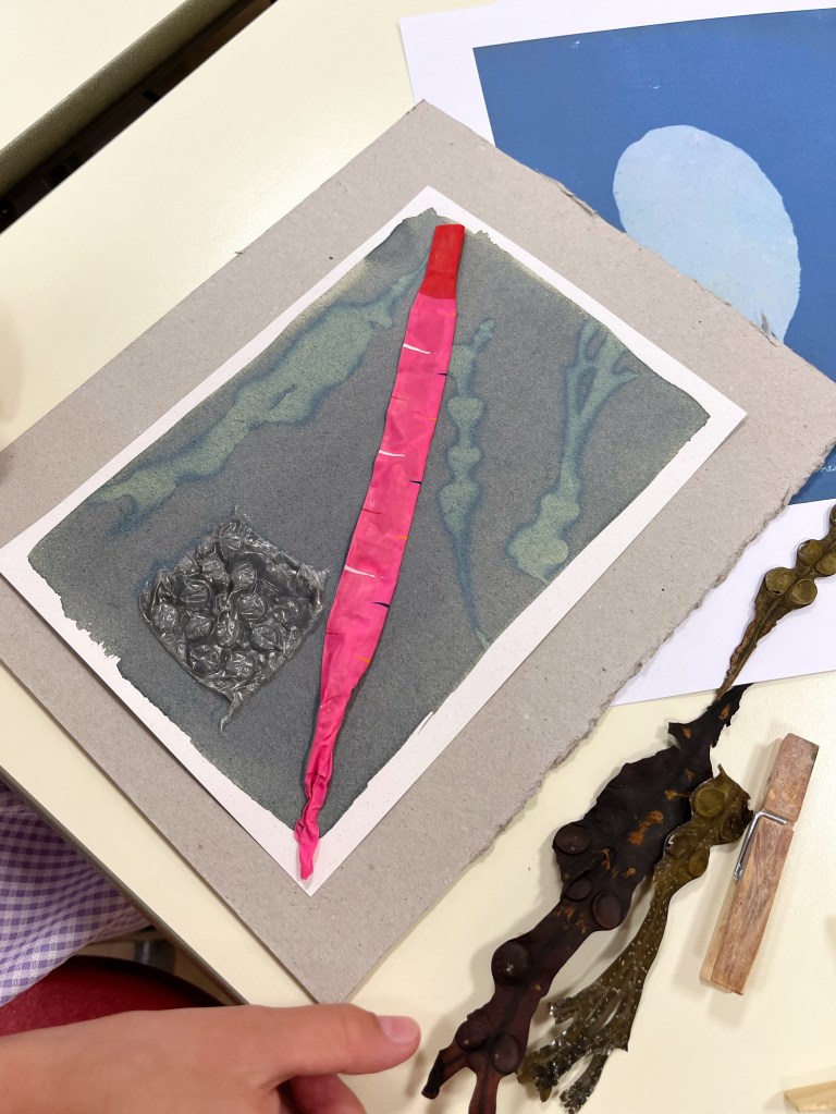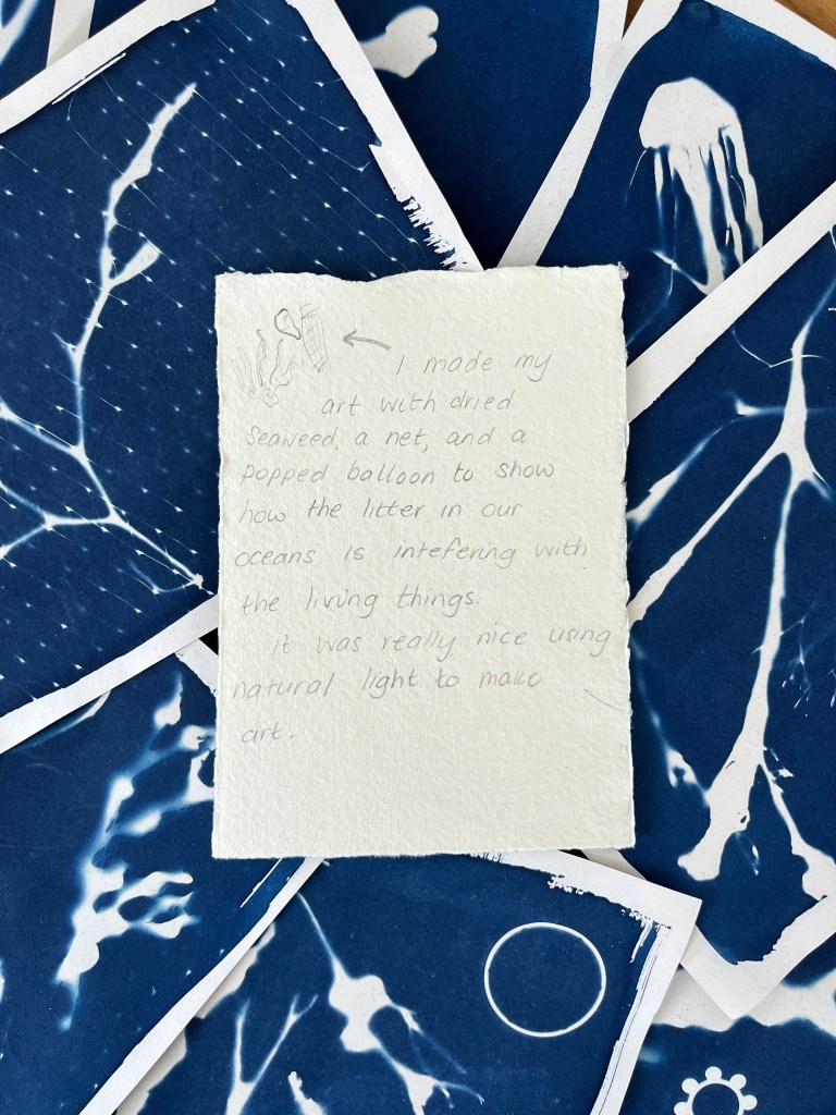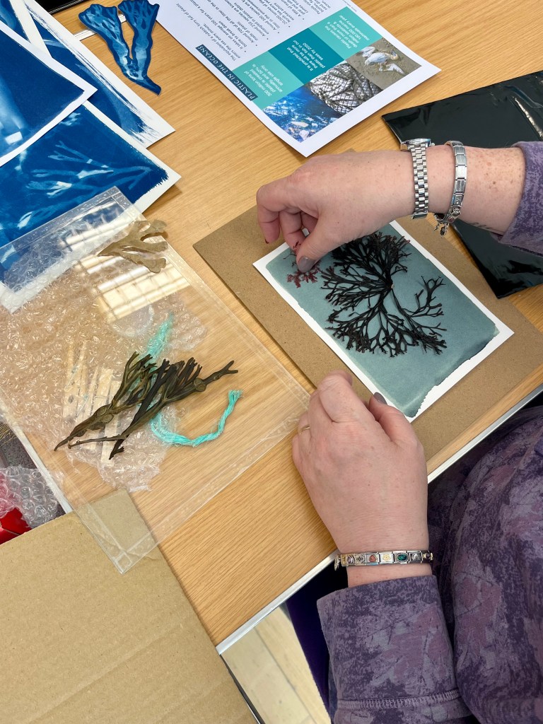 In the summer of 2023 I launched the exhibition of the community art project I had been working on in the beginning half of the year. Commissioned by Invisible Dust and Yorkshire Wildlife Trust as part of their Wild Eye art and nature project, I worked with different community groups and members of the public introducing them to the pioneering work of English botanist and artist Anna Atkins and the photographic process cyanotype, to make images using seaweed and litter collected from local beaches. Groups included Scarborough Sixth Form, Barrowcliff Primary School, Scarborough Disability Action Group, and Gallows Close Community Centre. The project, “After Anna: Blueprint Impressions from Today’s Seas” reflects on the important role of seaweed to help mitigate climate change as well as the problem of marine pollution. It references Atkins’s extensive study “Photographs of British Algae: Cyanotype Impressions (1843-1853), considered the first book to have been illustrated with photographic images, and reflects on how our seas have changed in the 180 years since it was first published, with several species of seaweed now lost and an ever increasing amount of plastic waste invading the marine ecosystem. The project resulted in an exhibition across two spaces in Scarborough: a shop window at 33 Newborough, where the original prints were exhibited, and large scale banners of a selection of the prints were displayed in the iconic Scarborough Market Hall.